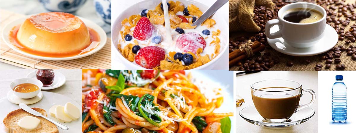 Pudding, Corn Flakes ( with Milk and Fruits), Bread with Veg Stew / Butter & Fruit Jam, Veg Noodles/Pasta, Coffee / Tea /Black Coffee, Mineral Water Bottle – 300 ml