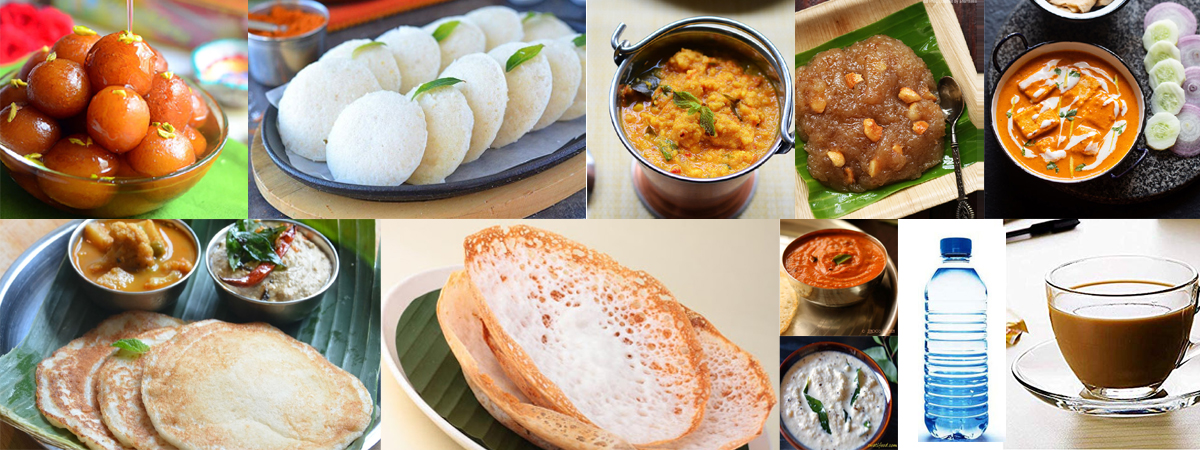 Gulab Jamoon/ Bread Alwaa , Mallipoo Idli , Vadha Karry , Aappam , Paneer Butter Masala, Kal Dosai, Coconut Chutney, Kara Chutney, Sambar, Coffee/Tea , Mineral Water Bottle – 300 ml