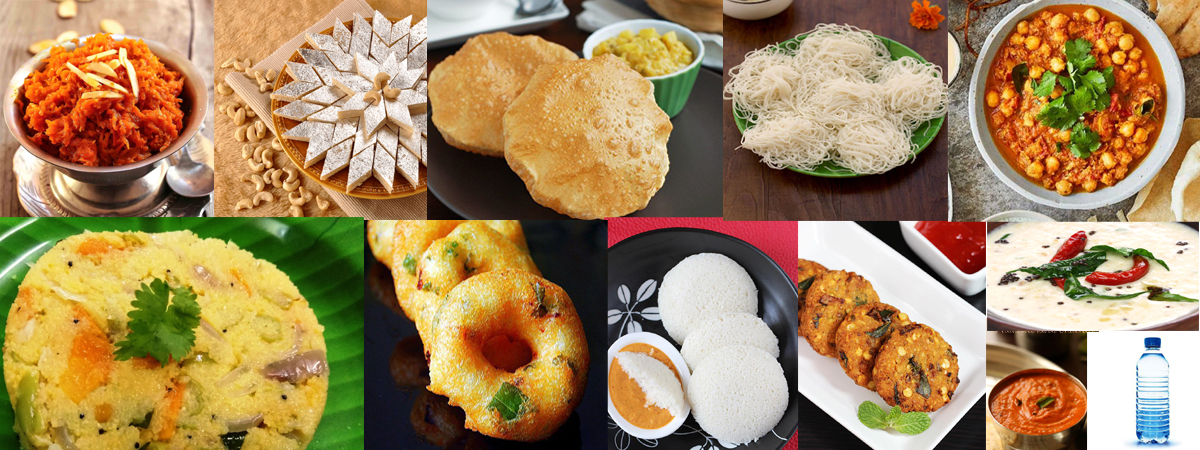 Carrot Halwa/ Kaju Kathili, Idly, Medhu Vadai, Kichadi, Mini Masal Vadai, Idiyappam, Poori, Chenna Masala, Coconut Chutney, Sambar, Coffee/Tea, Mineral Water, Bottle – 300 ml